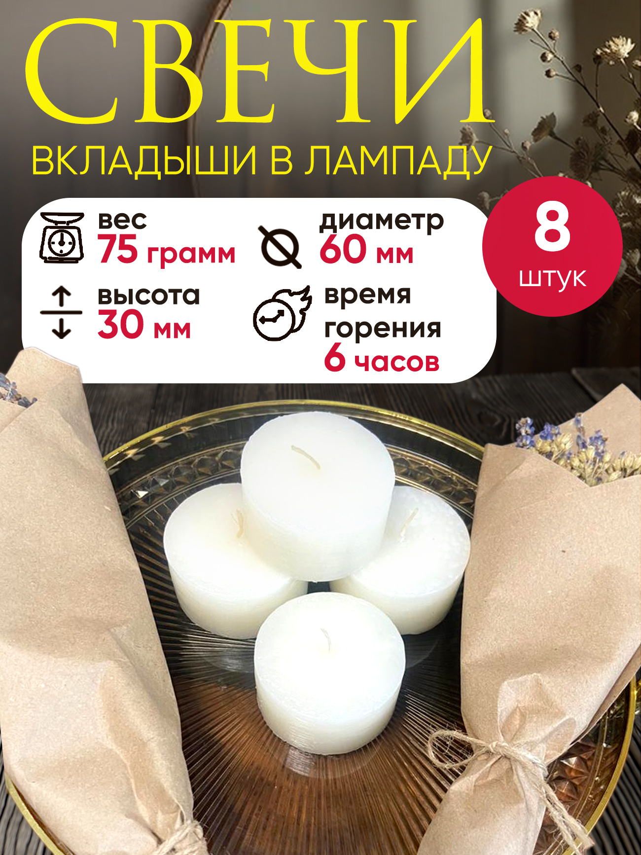 | Свеча в лампу белая 75 г (30х60мм) | 25,90 руб. | 12 шт. | 311 руб. |